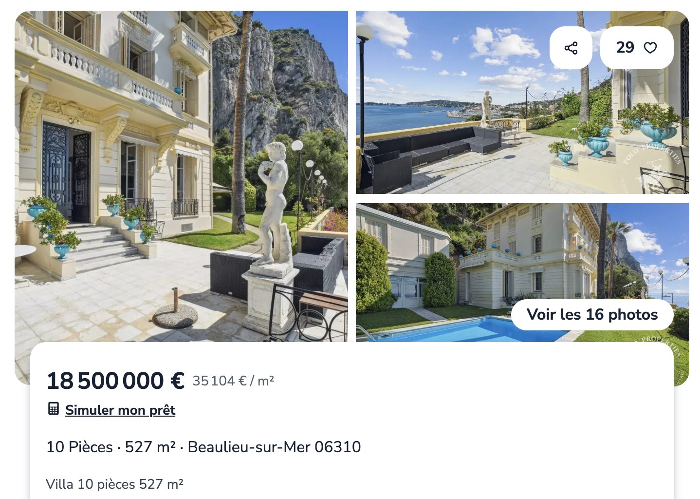 Bien d’exception : cette villa de 527 m² à Beaulieu-sur-Mer (Alpes-Maritimes). Construite en 1905, elle est située dans l’un des secteurs les plus prisés de la Riviera. Affichée à 18,5 millions d’euros (35 104 €/m²), cette demeure incarne le raffinement de la Belle Époque méditerranéenne. Répartie sur 10 pièces et 5 chambres, elle offre une vue mer exceptionnelle. Elle séduit également par ses volumes généreux baignés de lumière naturelle. Elle dispose d’une piscine et d’un ascenseur, sur un terrain de plus de 1 000 m². Ce bien illustre parfaitement l’attractivité des villas de luxe sur la Côte d’Azur auprès des acquéreurs les plus exigeants.