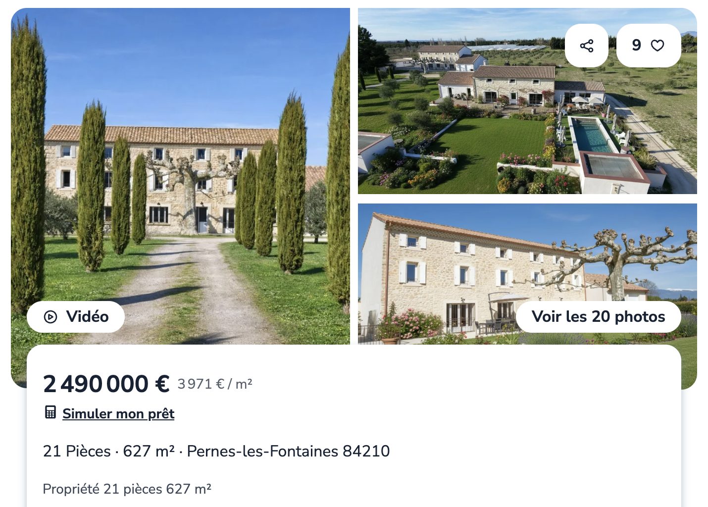 Ce vaste domaine de 627 m² à Pernes-les-Fontaines (Vaucluse) incarne un superbe bien de caractère. Affiché à 2,49 millions d’euros (3 971 €/m²), il propose 21 pièces et 17 chambres. Édifié en 1810, il s’étend sur 2 hectares plantés de 450 oliviers. En outre, il offre une vue remarquable sur le Mont Ventoux. Ce bien immobilier de prestige en Provence conjugue résidence familiale de standing et potentiel hôtelier haut de gamme. Un profil rare sur le marché immobilier de prestige en PACA.